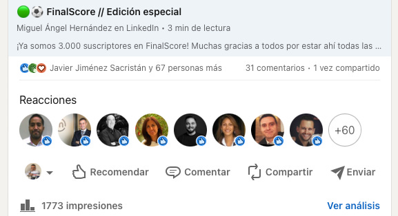 68 recomendaciones, 31 comentarios y 3 días después solo llega a 1.773 impresiones. Una actualización cualquiera con tantos likes y mensajes debería estar por las 4-5.000 impresiones. En fin, cosas de los algoritmos que me desesperan.