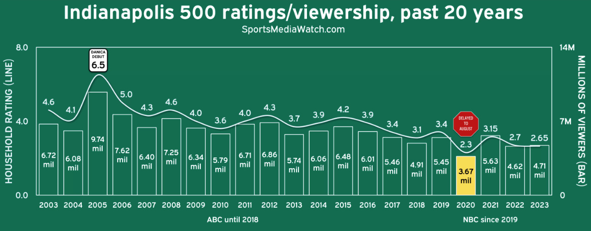 🛞 También se han publicado los datos de audiencia de la carrera Indy500 de la que os hablé la semana pasada: 4,71 millones de espectadores, todavía lejos de las audiencias de la F1 en EEUU cuyo promedio por carrera en 2022 era de 1,4 millones de espectadores. Pero lo que llamó mi atención es la gráfica de audiencias de la Indy500 desde 2002 y como ha ido descendiendo poco a poco en los últimos 10 años. No soy un experto en este tema y se me hace complicado analizar los factores que lo causan, pero dudo que sea efecto del auge de la F1, que solo debería haber afectado en los últimos 3-4 años.