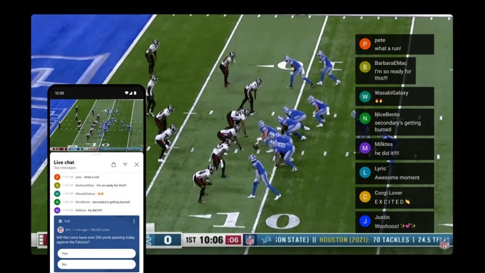 Por el contrario, Youtube acaba de anunciar que sus retransmisiones de la NFL tendrán chat integrado, encuestas, multicanal y highlights. Y pronto incluirán e-commerce.